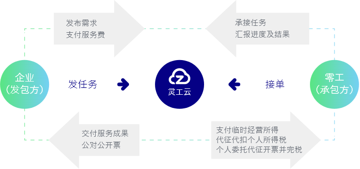 企业和自由职业者完成发接单交易后,由平台帮助个人汇总申报纳税,开具相应发票给企业入账