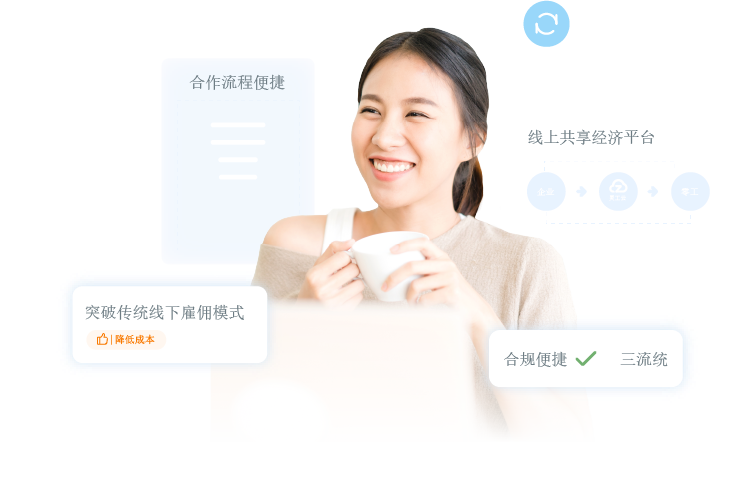提供一站式灵活用工服务,大量非全职、临时性服务人员。重塑劳动用工关系,解决企业用工波峰波谷需求,达成线上共享经济平台合作模式。提升客户组织灵活性、降低雇佣风险和成本。